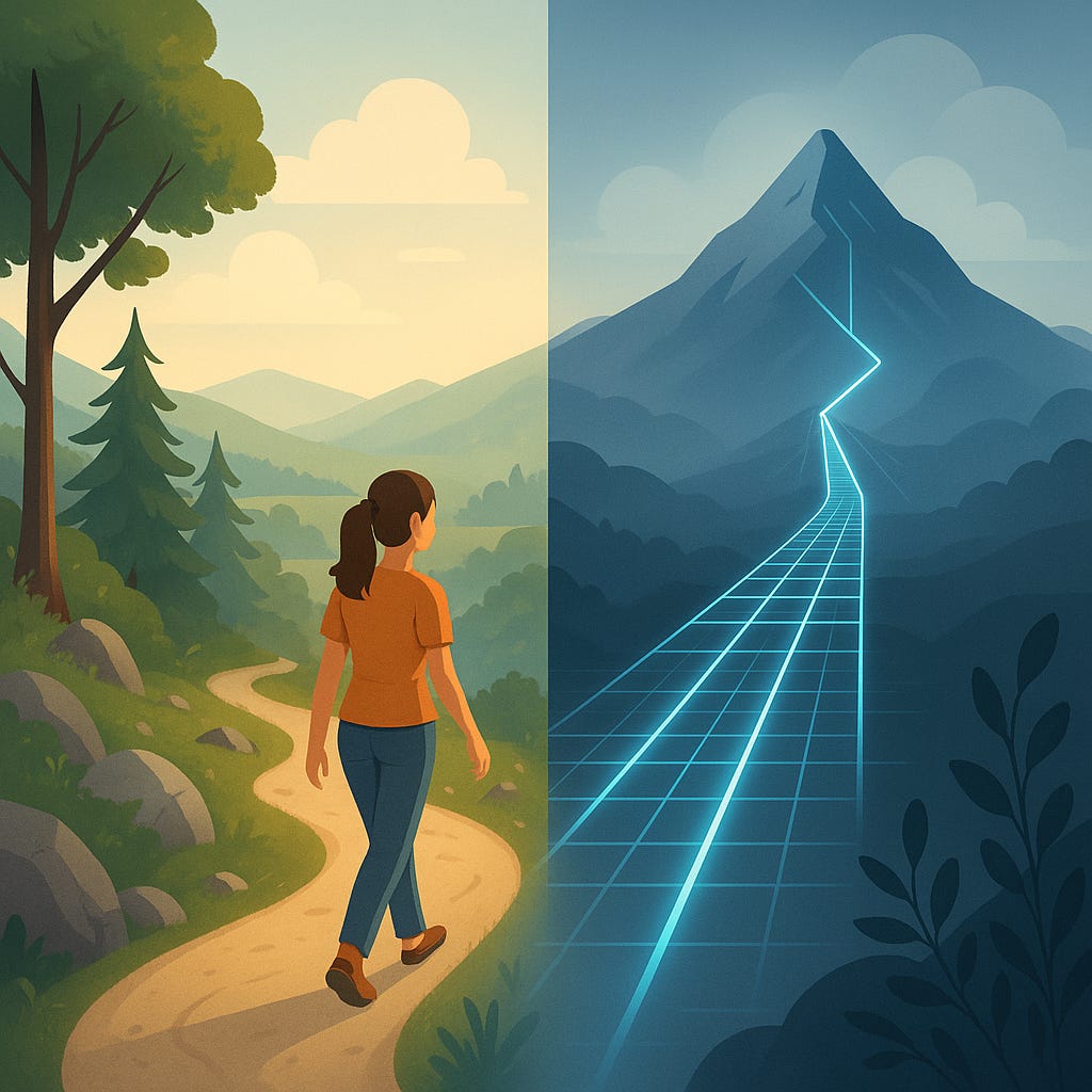 Equipped with this understanding, we can then make wiser decisions about how to chart an aligned course of action toward our goals. There are many ways up the mountain, some quicker than others. AI offers what appears to be a very quick trip to the top. But when we prioritize efficiency and convenience above all else—getting from desire to fulfillment as quickly as possible—we risk atrophying the very human qualities that make life worthwhile. If we're not careful about how we pursue our goals in an AI-mediated world that sees all friction as “inefficient,” we may find ourselves with everything we thought we wanted while becoming people we never intended to be.