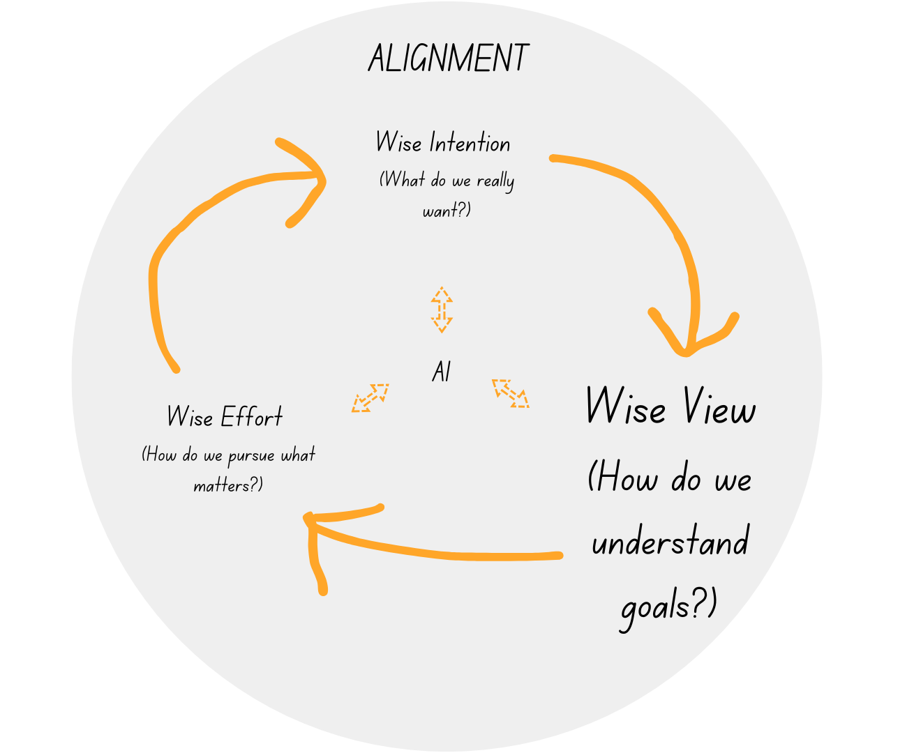 No matter how these systems continue to develop, we have a better chance at aligning AI if we can model alignment ourselves. As we explored in part I of this series, part of what that entails is pursuing goals that actually lead toward less suffering and not just more craving (Wise Intention). But even with well-intentioned goals, we can still end up further from what we actually want if we don't understand how to hold those goals lightly (thank you, proxy failures). So, just as crucial for alignment is the understanding that all goals are ultimately empty, which invites us to relate to them with greater flexibility and less attachment (Wise View).